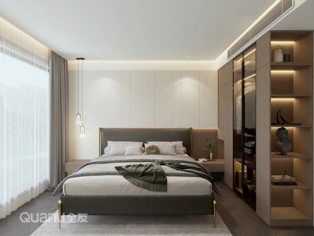 步入主(zhu)卧,玻璃、燈光、皮革、原木(mù)互相搭配(pei),營(ying)造(zao)出高(gao)級而優(you)雅的(de)睡眠氛圍,同時擡高(gao)陽(yáng)檯(tai)定製(zhi)地檯(tai),一(yi)箇(ge)氛圍感休閑區(qu)便悄然誕生(sheng)。