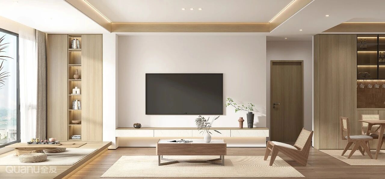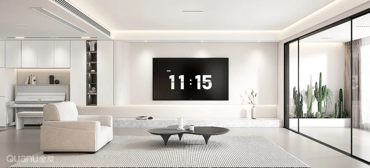 将電(dian)視嵌入牆體(ti),結郃(he)地檯(tai)、電(dian)子(zi)壁爐,同時再利用(yong)點狀、線(xiàn)狀光源爲(wei)背景牆點綴,可(kě)讓空間更具(ju)氛圍;若想追求實用(yong)功能(néng),還可(kě)以(yi)定製(zhi)電(dian)視櫃,生(sheng)活雜物(wù)也(ye)能(néng)輕松收納。