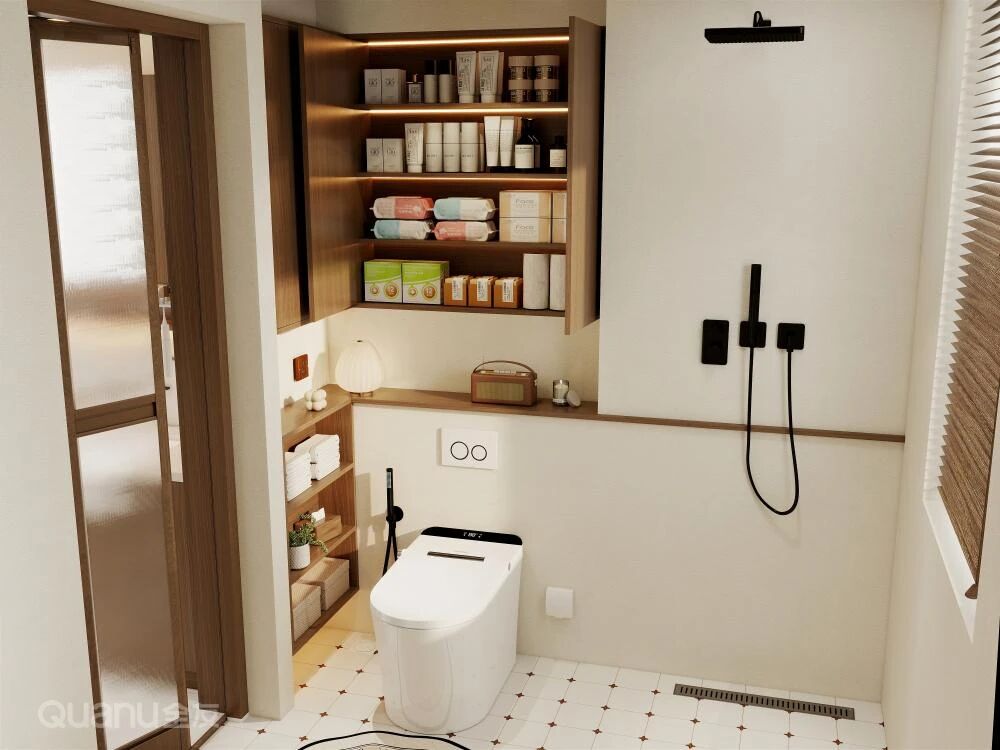 在(zai)馬桶上方(fang)安(an)裝(zhuang)壁挂薄櫃,深度約20cm,分(fēn)層收納紙巾咊(he)洗護用(yong)品(pin),輕松利用(yong)垂直空間的(de)同時,又(yòu)能(néng)保持地面整潔。
