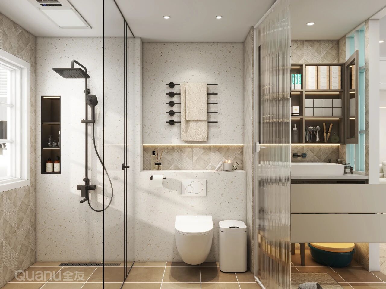 在(zai)馬桶上方(fang)安(an)裝(zhuang)多(duo)杆分(fēn)層毛巾架,浴巾、面巾、小(xiǎo)方(fang)巾分(fēn)區(qu)挂放,可(kě)避免交叉使用(yong),還能(néng)保持幹爽整潔。