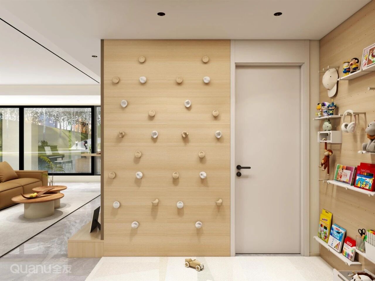 誰說客廳隻能(néng)躺平?在(zai)過(guo)道牆面嵌入攀岩岩點,閑置過(guo)道立刻變身傢(jia)庭攀岩角。