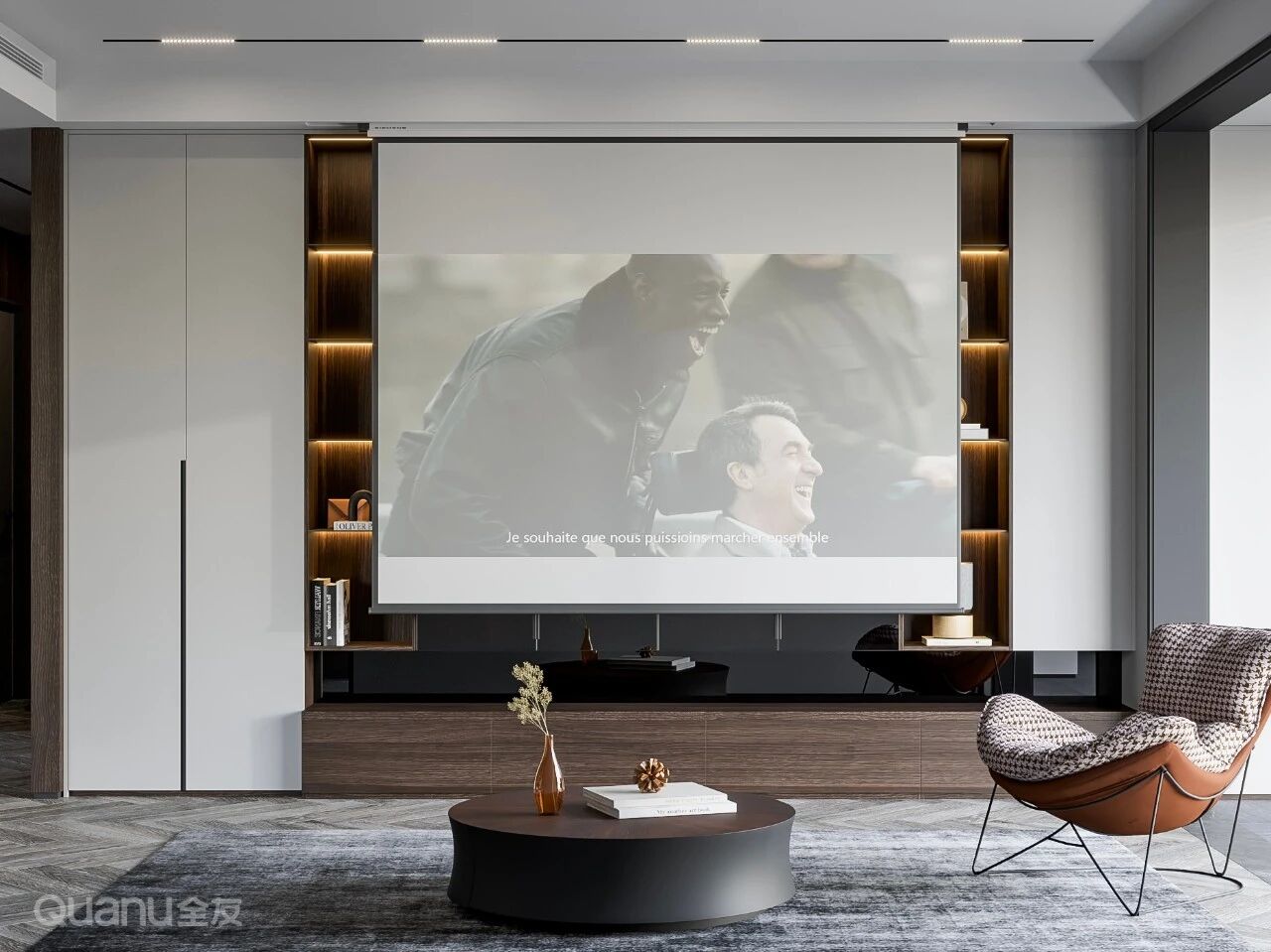 需要觀影時,幕布降下,客廳變身沉浸式(shi)影院;日(ri)常居傢(jia)時,幕布收起,所有(yǒu)雜物(wù)皆可(kě)藏入櫃體(ti),客廳整潔如初。