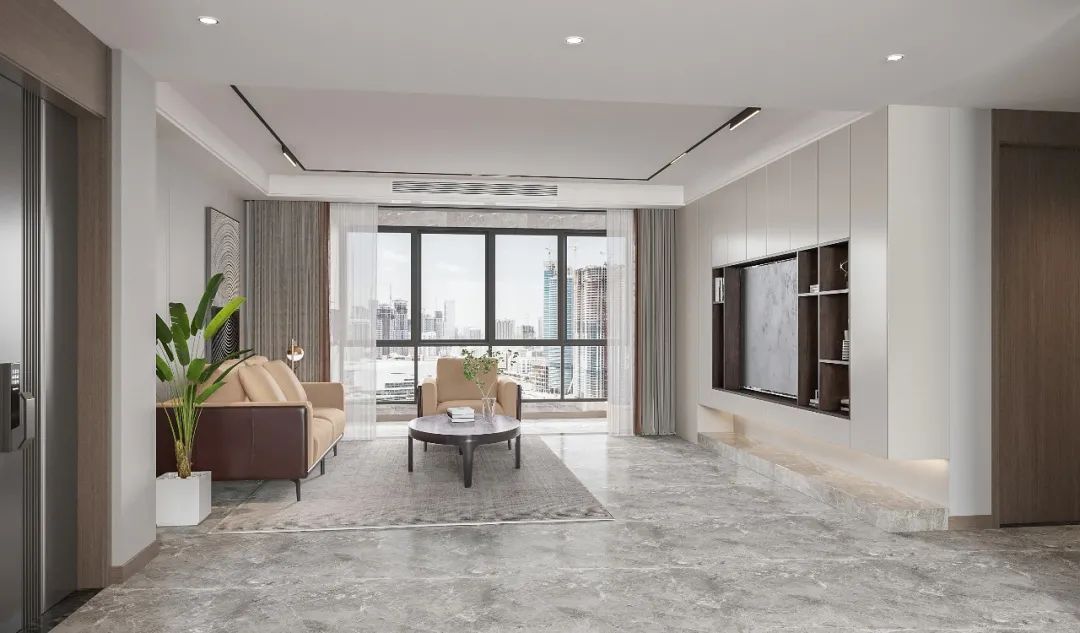 客廳光線(xiàn)極佳,爲(wei)了(le)不浪費良好采光,同時也(ye)滿足鄒女士簡單(dan)生(sheng)活的(de)需求,客廳沒有(yǒu)過(guo)多(duo)繁複裝(zhuang)飾,整體(ti)以(yi)白色爲(wei)基調,搭配(pei)淺駝色皮沙髮(fa),低調有(yǒu)質(zhi)感。(YOYO小(xiǎo)提示~爲(wei)了(le)更好展(zhan)示客廳空間,畫面中(zhong)就暫時先(xian)将玄關隐去了(le)哦~)整牆定製(zhi)電(dian)視櫃“內(nei)有(yǒu)乾坤”,容量豐(feng)富(fu),極簡設(shè)計(ji),線(xiàn)條幹練流暢,無把手櫃們(men)視覺統一(yi),櫃體(ti)更顯輕盈;底部(bu)留空設(shè)計(ji)打消了(le)整牆電(dian)視櫃帶來的(de)壓迫沉悶感,內(nei)置燈帶讓客廳更顯靈(ling)動(dòng)高(gao)級。
