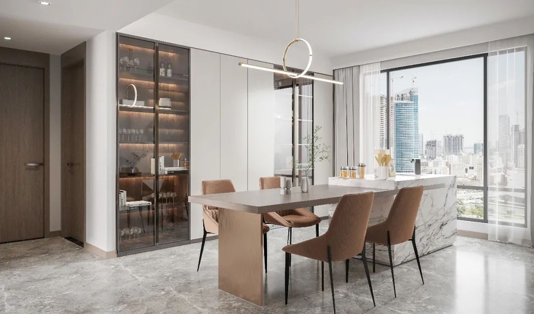餐廳旁定製(zhi)整牆餐邊櫃,茶色玻璃櫃們(men)滿足儲物(wù)+展(zhan)示的(de)需求,可(kě)以(yi)存放一(yi)些紅(hong)酒、杯具(ju),彰顯出鄒女士的(de)不俗品(pin)味,玻璃櫃們(men)也(ye)讓餐廳空間更顯通(tong)透大(da)氣(qi)。
