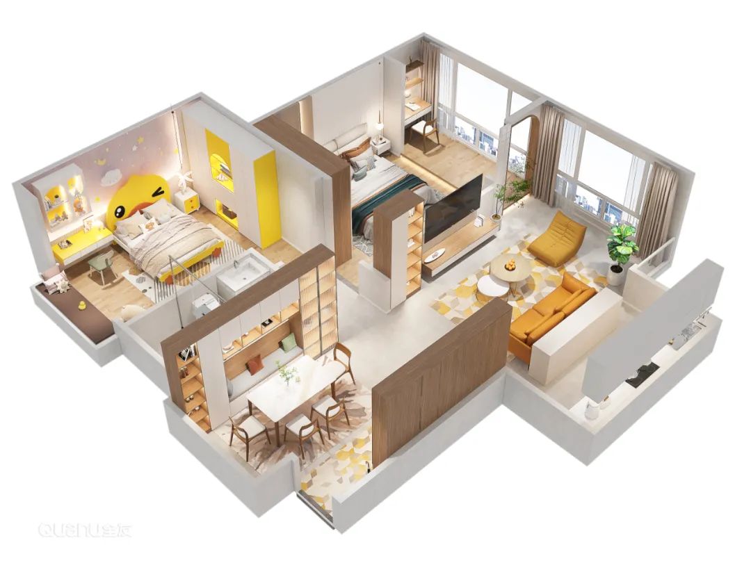 爲(wei)了(le)更符郃(he)孩子(zi)快樂成(cheng)長(zhang)的(de)需求,兒童房風格與其它空間有(yǒu)所差(cha)異,以(yi)明亮的(de)橙黃色爲(wei)主(zhu)色調,活力(li)十足。