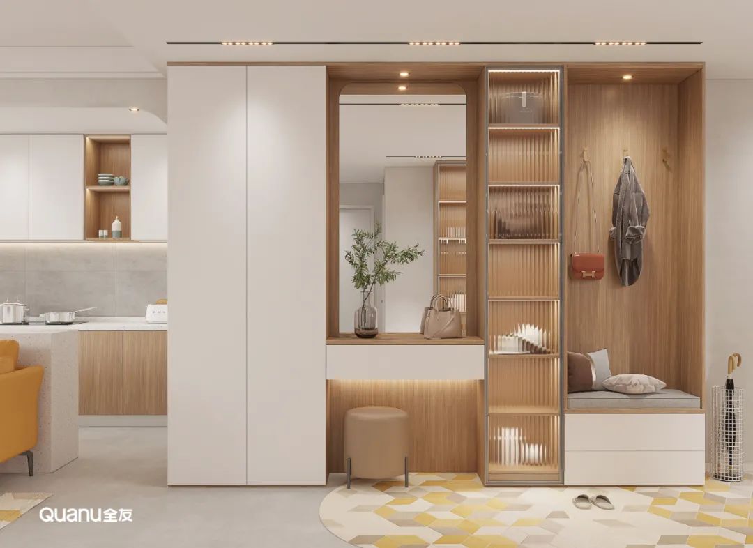 入戶(hu)定製(zhi)到(dao)頂式(shi)玄關櫃,超高(gao)們(men)闆大(da)氣(qi)簡約,原木(mù)紋理(li)細膩而自然。置物(wù)檯(tai)可(kě)拿(ná)放小(xiǎo)物(wù)件,內(nei)置鏡子(zi),加(jia)強入戶(hu)空間感,也(ye)方(fang)便整理(li)儀容。除此之(zhi)外,靠們(men)處還定製(zhi)了(le)卡座作(zuò)爲(wei)換鞋凳,上方(fang)櫃體(ti)沒有(yǒu)櫃們(men),安(an)裝(zhuang)挂鈎作(zuò)爲(wei)挂衣區(qu),可(kě)随手挂放包包、衣物(wù),出行更方(fang)便快捷。