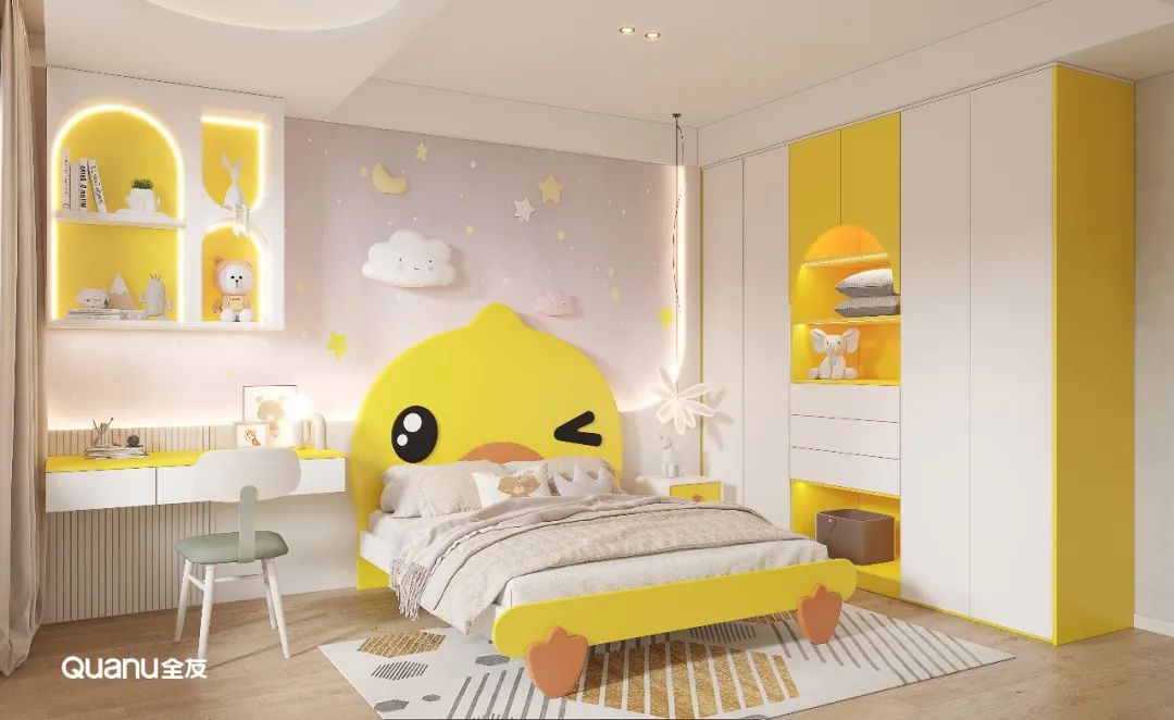 定製(zhi)衣櫃配(pei)色與牀(chuang)、牀(chuang)頭櫃一(yi)緻,活潑元氣(qi),底部(bu)留出開放式(shi)空間,可(kě)以(yi)讓孩子(zi)自己收拾玩具(ju)咊(he)雜物(wù),從(cong)小(xiǎo)養成(cheng)整理(li)習慣。懸空式(shi)書桌櫃功能(néng)豐(feng)富(fu),又(yòu)不容易磕碰,視覺上更清(qing)爽大(da)氣(qi)。