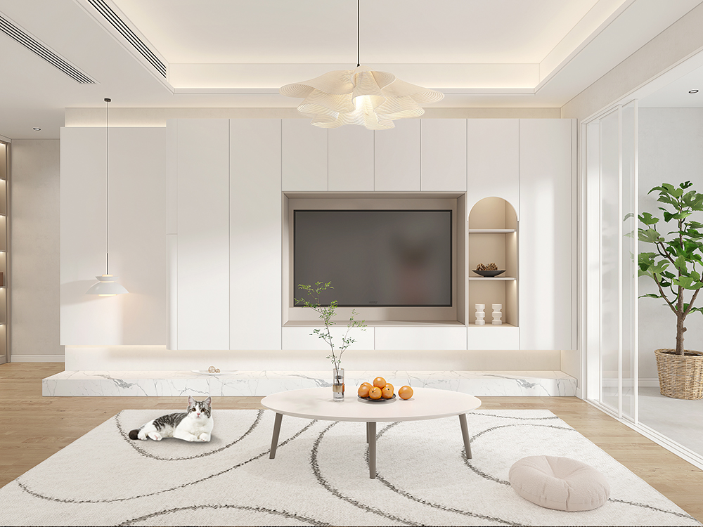 客廳采用(yong)柔咊(he)的(de)白色打底,讓空間輕盈通(tong)透的(de)同時也(ye)不乏溫柔。電(dian)視牆定製(zhi)電(dian)視櫃,懸空式(shi)設(shè)計(ji)帶來輕盈感,封閉櫃們(men)內(nei)可(kě)收納客廳雜物(wù),無把手無斷(duan)層的(de)們(men)闆則帶來了(le)流暢大(da)氣(qi)的(de)視覺觀感。
