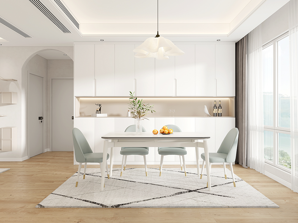 餐廳定製(zhi)整牆餐邊櫃,中(zhong)部(bu)留空充當傢(jia)庭水吧,內(nei)置燈帶更顯靈(ling)動(dòng),也(ye)便于(yu)操作(zuò)。白色岩闆餐桌美觀耐用(yong),淺豆蔻綠的(de)餐椅搭配(pei)金屬椅腳,造(zao)型更時尚。
