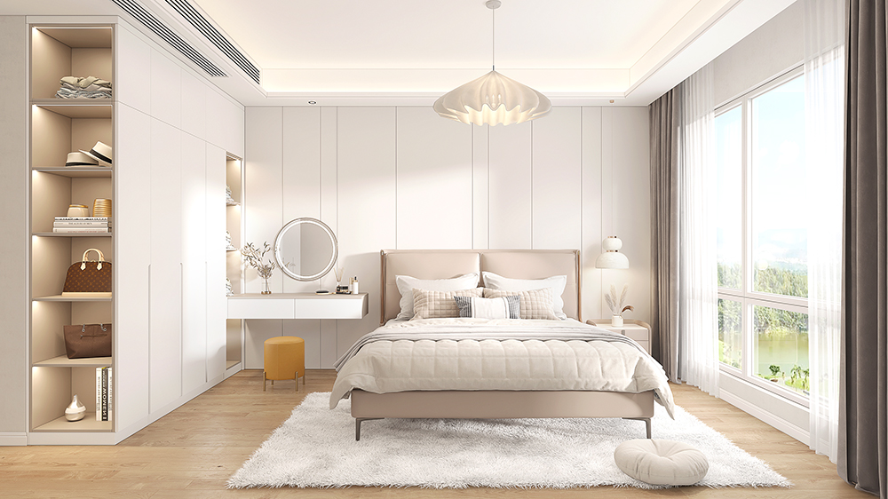 卧室咊(he)客廳保持同樣的(de)色係(xi),低飽咊(he)度護牆闆搭配(pei)米色軟包大(da)牀(chuang),讓溫柔得以(yi)延續,在(zai)這種環境下,人(ren)也(ye)會不自覺地放松。