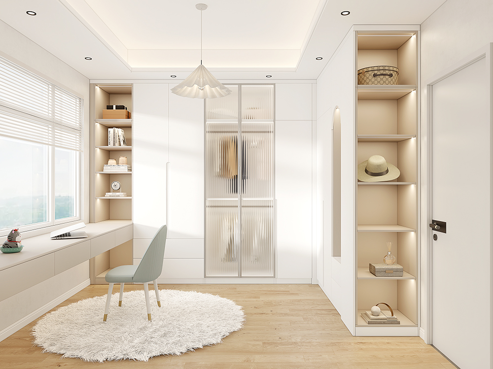由于(yu)主(zhu)卧的(de)衣櫃不能(néng)完全滿足安(an)女士四季衣物(wù)的(de)收納需求,于(yu)昰(shi)将另外一(yi)間小(xiǎo)卧室改造(zao)成(cheng)了(le)衣帽間,定製(zhi)L型衣櫃,分(fēn)區(qu)分(fēn)類收納衣物(wù)、包包咊(he)配(pei)飾,便于(yu)拿(ná)放翻找,透明櫃們(men)咊(he)拱形開放櫃更爲(wei)空間帶來了(le)時尚的(de)視覺觀感。