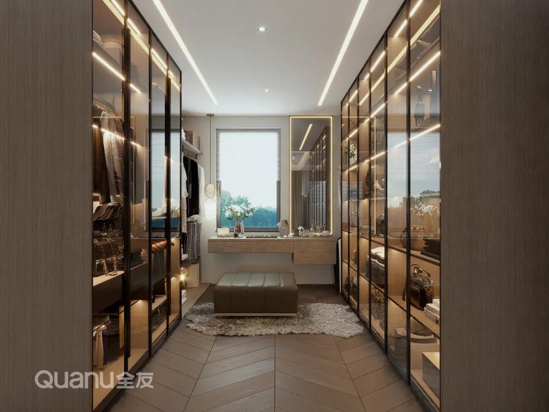 燈帶光影透過(guo)兩側玻璃櫃們(men)進(jin)行點綴,精(jīng)緻感洋溢衣帽間,彰顯空間格調。同時增添光線(xiàn),方(fang)便裴女士挑選衣物(wù),靠窗處定製(zhi)懸空檯(tai)面,換衣梳妝一(yi)氣(qi)呵成(cheng)。