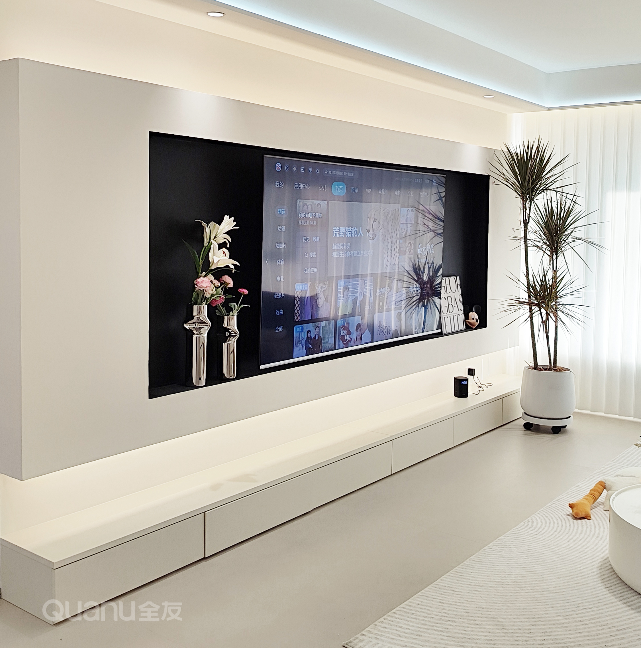 懸浮電(dian)視牆與燈帶咊(he)諧搭配(pei),空間靈(ling)動(dòng)又(yòu)輕盈;奶油白電(dian)視櫃,既承(cheng)擔了(le)儲物(wù)功能(néng),又(yòu)展(zhan)現(xian)出簡潔大(da)氣(qi)的(de)視覺美感。