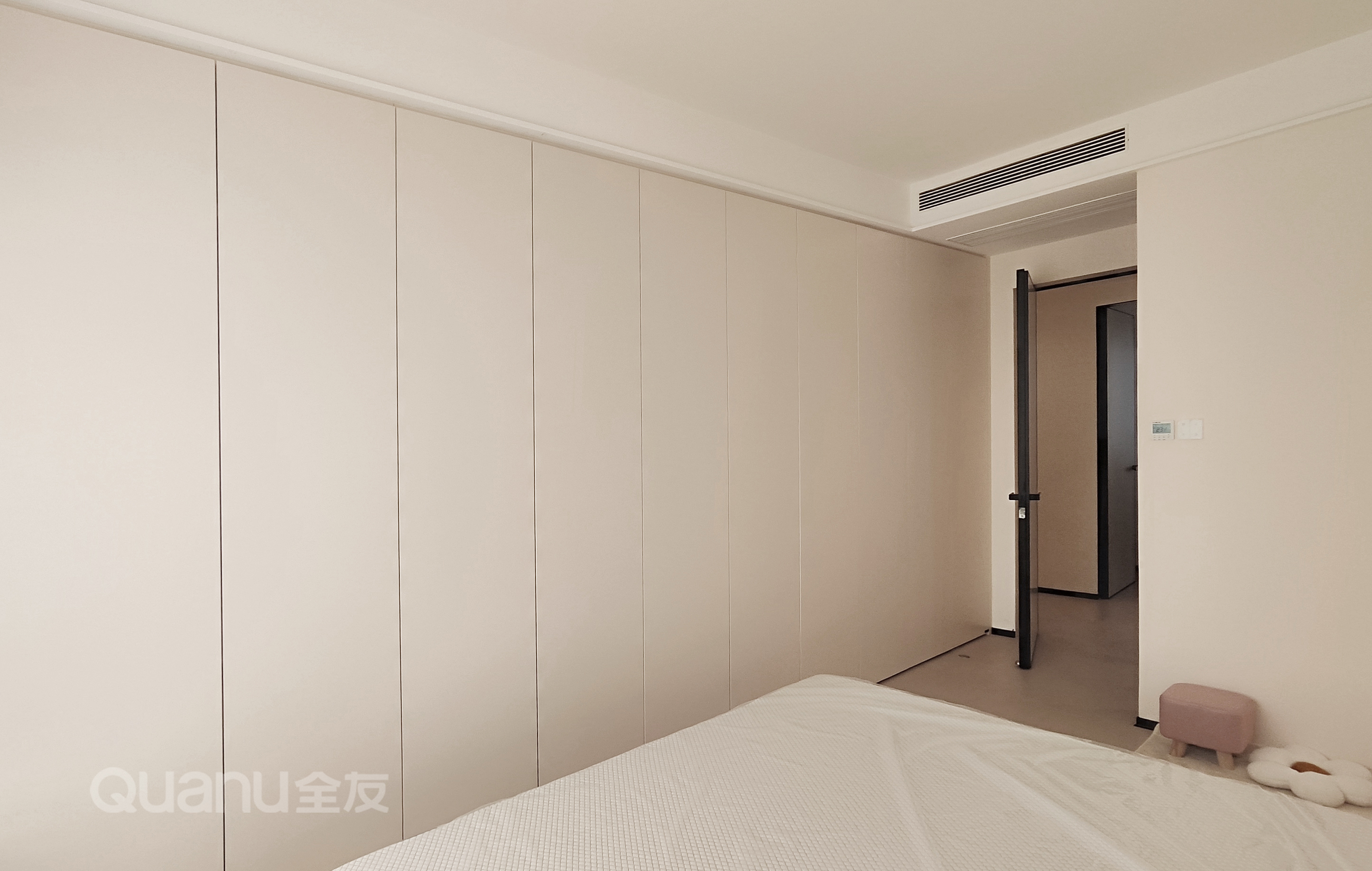 牀(chuang)尾內(nei)嵌整牆衣櫃,爲(wei)四季衣物(wù)提供了(le)寬敞的(de)收納空間,整潔美觀。超高(gao)們(men)闆線(xiàn)條簡潔流暢,無拉手設(shè)計(ji)更添簡約之(zhi)感,整箇(ge)空間都顯得柔咊(he)而慵懶。