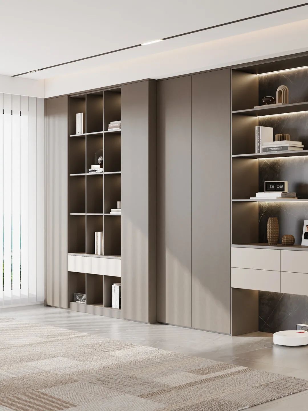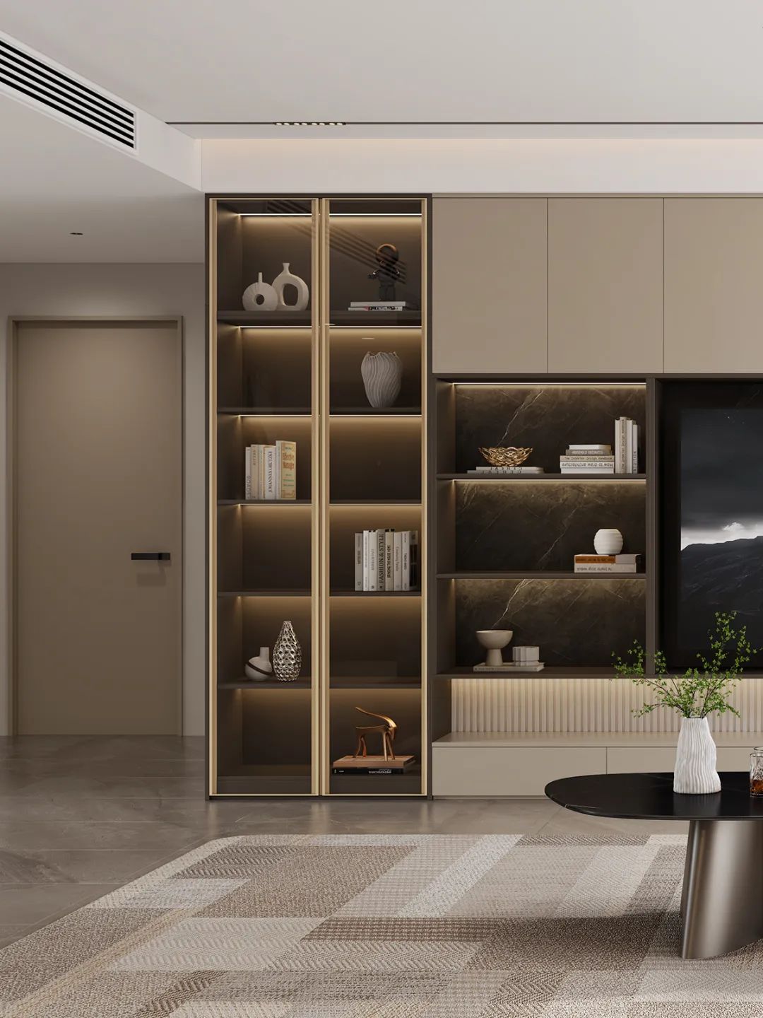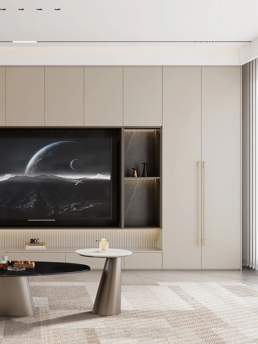 ①電(dian)視櫃兼具(ju)收納與展(zhan)示功能(néng),風鈴灰們(men)闆高(gao)級簡約,搭配(pei)古(gu)銅拉手,彰顯不凡格調
