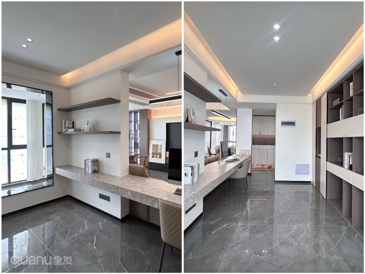 也(ye)可(kě)通(tong)過(guo)地檯(tai)劃分(fēn)區(qu)域(yu)空間,隻需将跼(ju)部(bu)地面擡高(gao)10cm,底部(bu)嵌入隐形燈帶,即可(kě)得到(dao)一(yi)箇(ge)氛圍感滿滿的(de)開放式(shi)書房。