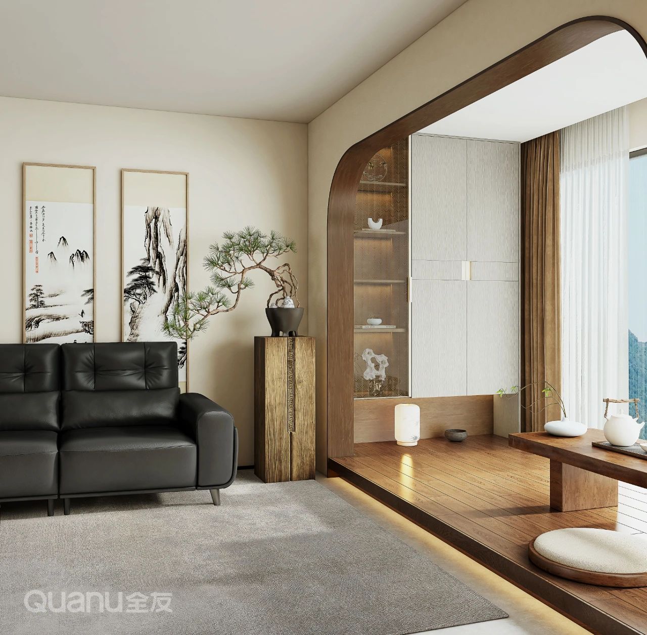 ①若陽(yáng)檯(tai)空間較爲(wei)寬敞,不妨将地面擡高(gao)做地檯(tai)設(shè)計(ji),放置茶檯(tai)、蒲團(tuán),與親朋好友閑聊、品(pin)茶,盡享惬意時光;同時,再利用(yong)兩側牆面定製(zhi)儲物(wù)櫃,物(wù)品(pin)擺件咊(he)茶具(ju)書籍都能(néng)有(yǒu)序收納,空間利用(yong)率拉滿。