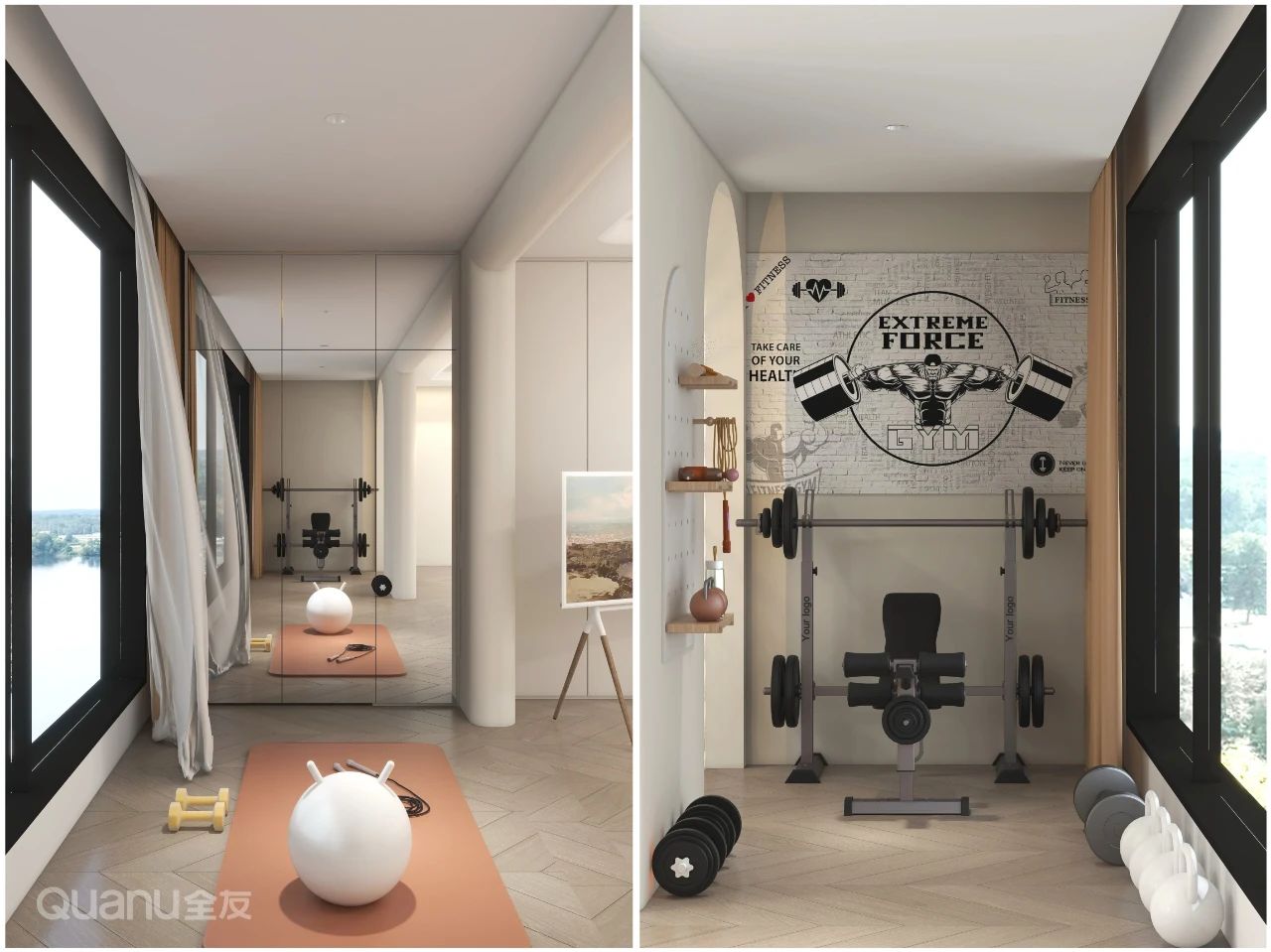 除了(le)啞鈴、瑜伽墊外,若預算充裕,還可(kě)以(yi)添置跑步機(jī)、橢圓機(jī)等(deng),搭配(pei)鏡面櫃們(men),方(fang)便觀察動(dòng)作(zuò)規範度,還能(néng)實現(xian)視覺擴容。