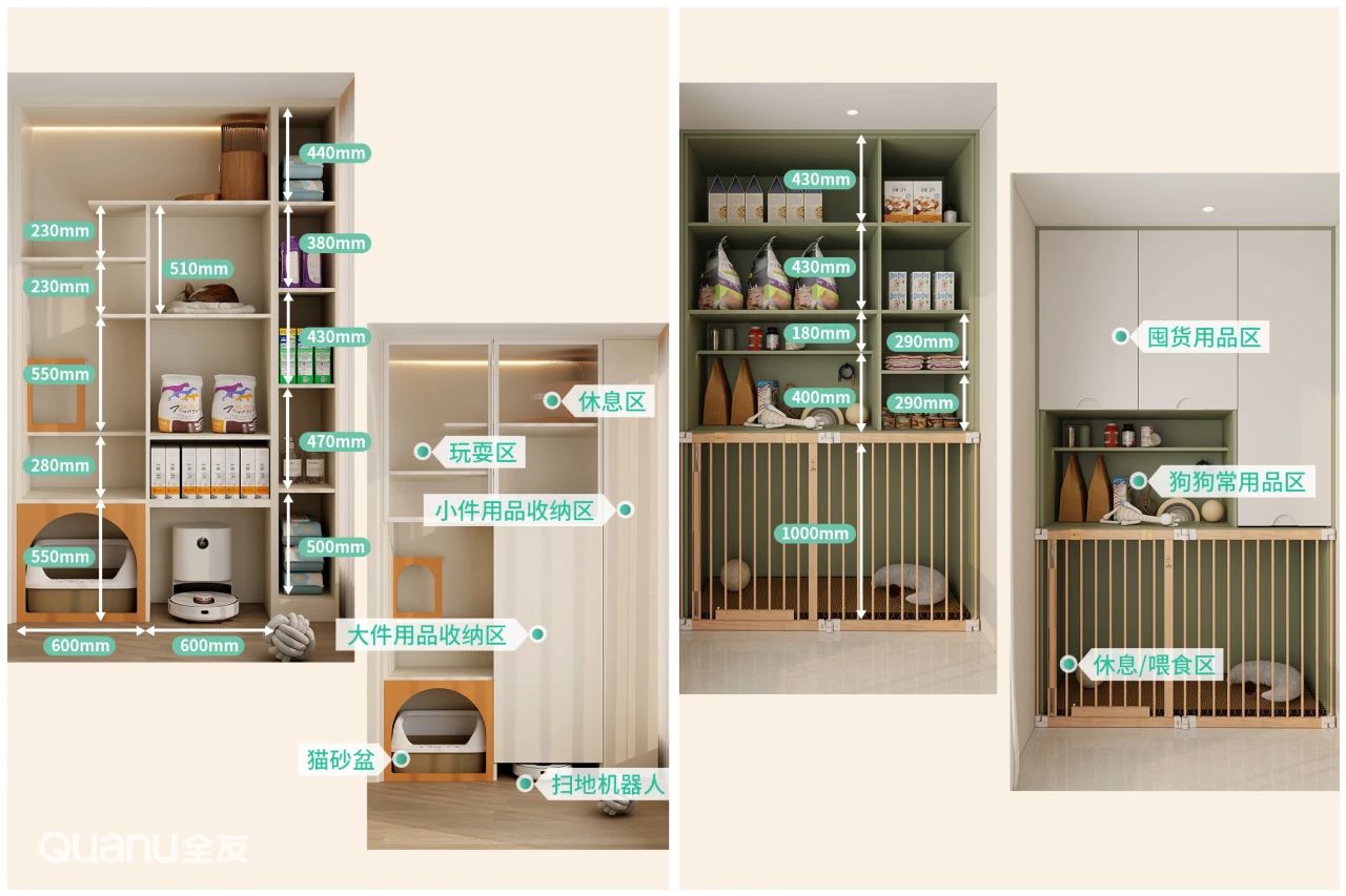 寵物(wù)櫃通(tong)常可(kě)劃分(fēn)爲(wei)休息區(qu)飲食區(qu)活動(dòng)區(qu)咊(he)收納區(qu)等(deng)功能(néng)闆塊。